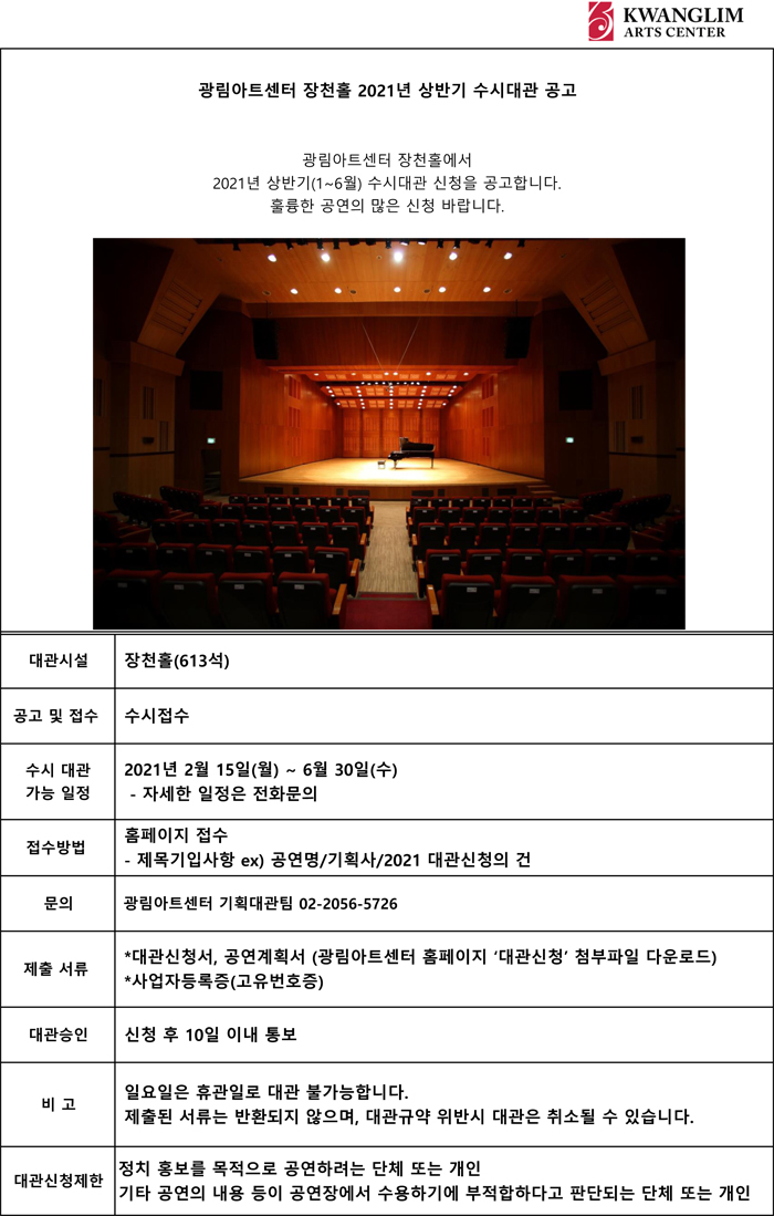 광림아트센터 장천홀 2021 상반기 수시대관공고